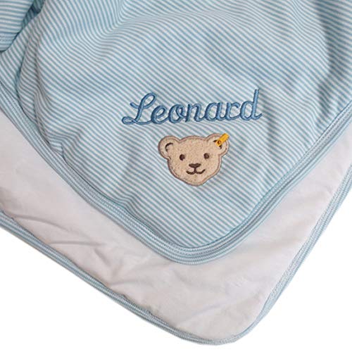 die Babydecke wird mit Ihrem Wunschnamen (max. 10 Buchstaben) angepasst in der abgebildeten Stickschrift bestickt