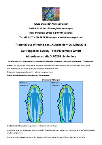 Sweety-Toys bietet ab sofort alle Plüschtiere und Kuscheltiere mit wohlfühlender Energie an. Durch die langjährige Erfahrung von Herrn Dieter Fiedler können wir jetzt unsere Produkte mit natürlicher positiver Energie veredeln. Lassen Sie Ihr Sprössling mit dem softweichen Sleepy einschlafen, ein Wohlfühlerlebnis. Die positive Energie sorgt für mehr Wohlbefinden und Lebenskraft bei Groß und Klein. Das Prinzip der Huldigen Geometrie wurde in Zusammenarbeit mit Dieter Fiedler in der Praxis Dr. Schuhmacher entwickelt. Über die Pflege unserer harmonisierten Kuscheltiere: Das Wohlfühl-Kuschel-Sortiment ist bei 30° Stufung mit Feinwaschmittel per Handwäsche oder in der Maschine im Feinwaschnetz( Kurzwaschprogramm bzw. reduzierter Schleudergang) waschbar, OHNE, dass es zu einer Beeinträchtigung Ihrer Wirkungsweise kommt. Unsere gestörte Lebensenergie- Chi Energie- Kundalini- Energie. Nichts kann die Lebensenergie eines Menschen stärker und vor allem dauerhaft nerven als Stress, Ängste und dauerndes statisches Einsitzen, denn sie kultivieren sich immer in Form von messbaren Muskelverspannungen aus. Haben wir, ohne aus der Gesellschaft auszusteigen, heute überhaupt noch die Zeit, unsere inneren Kräfte zu stärken? JA! Durch das Prinzip des „HEILIGEN GEOMETRIE“. Dies wurde im Zusammenarbeit mit Dieter Fiedler in der Praxis Dr. Schuhmacher entwickelt. Die Wirkungen dieses Symbols der Huldigen Geometrie sind : Ablösung von Problemen, Sorgen und Ängsten durch Ur-Trauen in die göttliche Ordnung. Der PC2- Muskel, der den gesamten elektrischen Spannungshaushalt im Körper steuert wird aktiviert und die Energie des Lebens kann erneut frei fließen. Weitere Fragen bezüglich dieses Themas beantwortet Dieter Fiedler Ihnen gerne persönlich per Telefon. Die Nummer können Sie gerne beim Anbieter erfragen.