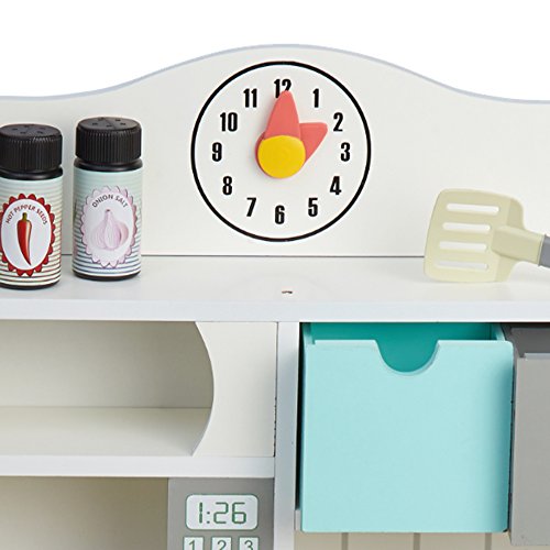 DETAILS: Klassische Holzspielzeugküche mit leuchtenden Farbakzenten und interaktiven „lebensechten“ Designmerkmalen, darunter: zu öffnende Backofen- und Mikrowellentüren, 3 drehbare/klickbare Backofenknöpfe, 2 Backofenbrenner, 2 Schubladen, 1 Spüle, 1 Unterschrank , & 1 Spielzeuguhr.