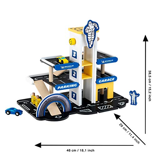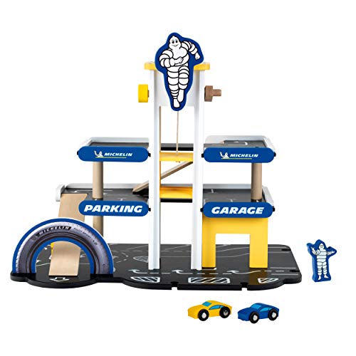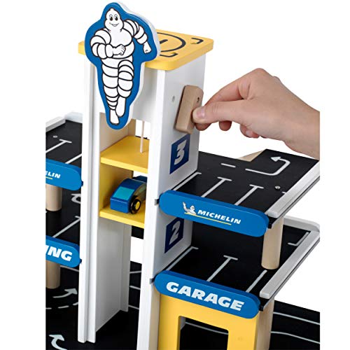 Bauen mit Holz boomt – im Großen wie im Kleinen. Das MICHELIN Parkhaus beweist es: Es geht über drei Etagen, hat stabile Auffahrtsrampen, bietet viele Parkplätze, zwei Tanksäulen und sogar einen Aufzug, der über einen Drehknopf leicht zu bedienen ist. An den Aus- und Zufahrten hat die stabile Garage Einkerbungen, an denen sie leicht mit anderen, gängigen Fahrbahnen kombiniert werden kann. Alles in allem also ein modernes Set für junge Auto-Fans, die dank der wertigen Bauweise lange damit spielen werden und mit ganz viel Spaß ihre Motorik, Hand-Auge-Koordination und Fantasie schulen. MICHELIN Parkhaus mit 3 Ebenen, Holz Das 39 Zentimeter hohe Parkhaus ist aus Holz gebaut und mit einem Lift, Tanksäulen, Abfahrten, Parkflächen, einem Hubschrauberlandeplatz und zwei Holzautos ausgestattet. Es ist kompatibel mit handelsüblichen Holzfahrbahnen und besticht durch das coole Michelin Design mit dem beliebten Michelin Männchen. – Maße: 46 cm x 29 cm x 39 cm – Geeignet für Kinder ab drei Jahren