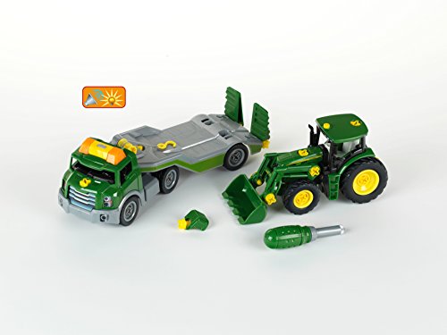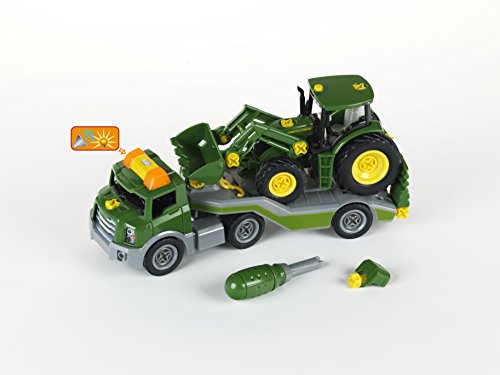 Transporter mit John Deere Traktor Entdecke die neue John Deere CONSTRUCTION Line. Baue deinen eigenen John Deere Traktor 6215 R im Maßstab von ca. 1:24. Nimm das Fahrgestell, montiere die Reifen, den Sitz, das Führerhaus und die Motorhaube. Bau deinen Transporter zusammen. Das Fahrgestell mit dem Führerhaus und die Räder an den Auflieger. Ziehe deinen Traktor mit der Seilwinde auf den Transporter. Licht und Sound an! Jetzt kann es losgehen! Der neue John Deere Traktor 6215 R kann ausgeliefert werden!