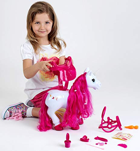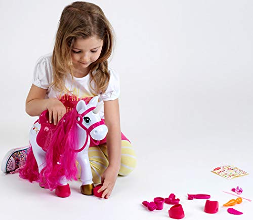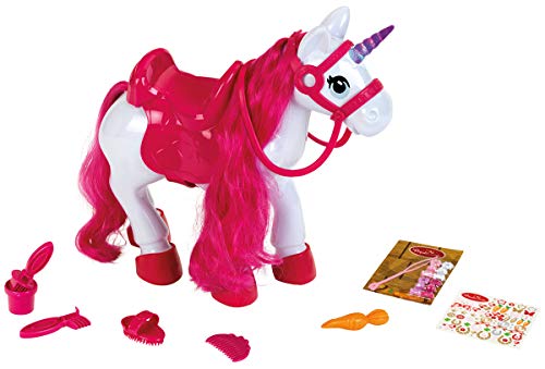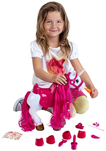 Das hübsche, liebenswerte Princess Coralie Einhorn hat ein magisches Horn, das – sobald es von kleinen Kinderhänden gedrückt wird – vor Freude leuchtet und ein sanftes Wiehern und Hufgetrappel erklingen lässt. Ein besonderes Vergnügen bereitet es Kindern, wenn sie die rosa Mähne mit Kamm und Striegel kämmen und mit Perlen verzieren. Dafür hat Theo Klein einen eigenen Perlenauffädler entwickelt, der spielerisch die Motorik schult und den kleinen Stylistinnen schnell und unkompliziert zu hübschen Ergebnissen verhilft. Sogar für Sattel, Trense, Futter, Hufpflege und bronzefarbene Hufschuhe für festliche Anlässe ist gesorgt. Das bezaubernde Einhorn bringt alles mit, was so ein magisches Wesen im Kinderzimmer alles braucht – sogar einen eigenen Stall, der sich aus der Verpackung bauen lässt.