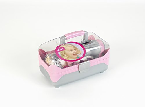 Zu dem Spielzeug-Frisierkoffer gehören ein batteriebetriebener Haartrockner im Braun-Design mit kindgerechten Funktionen, der mithilfe eines kleinen Ventilators kühle Luft herauspustet. Im Koffer enthalten sind zudem ein Kamm, eine Bürste, vier Haarklammern, vier Haarspangen, ein Haargummi, ein Spiegel, Lippenstift- und eine Parfumfläschchenattrappe