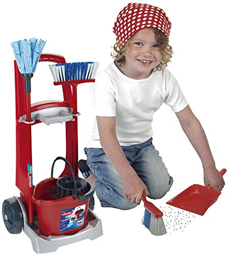 Zum Besenwagen im Vileda-Design gehört neben dem leicht zu montierenden Besenwagen ein Wischmop, ein Eimer mit Aufsatz, ein Besen sowie ein Handbesen mit Handschaufel.