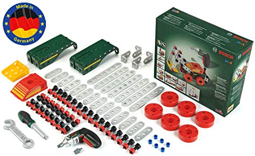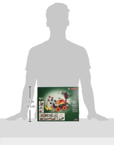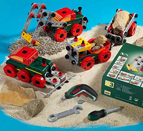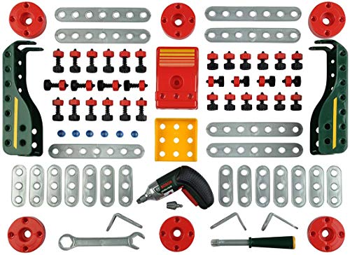 Dieses Set ist perfekt ausgestattet für Kinder, die gerne bauen und neues erfinden. Es enthält 107 Konstruktionselemente, Schraubendreher und Schraubenschlüssel und elf Anleitungen für den Bau von Fahrzeugen – vom Schaufelbagger bis zum Flugzeug. Sie lassen sich mit dem Bosch Akkuschrauber Ixolino II schnell zusammenbauen. Das macht den jungen Kreativen umso mehr Spaß, weil der Akkuschrauber nicht nur (fast) genauso aussieht, wie sein großer Bruder, sondern auch ähnlich klingt, die Schrauben rein und rausdrehen kann, sie dabei anleuchtet und sich allen dank auswechselbaren Aufsätzen anpasst. Das ganze Set ist aus hochwertigem Kunststoff, sorgfältig verarbeitet, sehr stabil und langlebig – Made in Germany. Es passt zu den Bosch- und Technico-Schraubsystemen aus dem Hause Klein und wird die Kinder für lange Zeit begleiten.