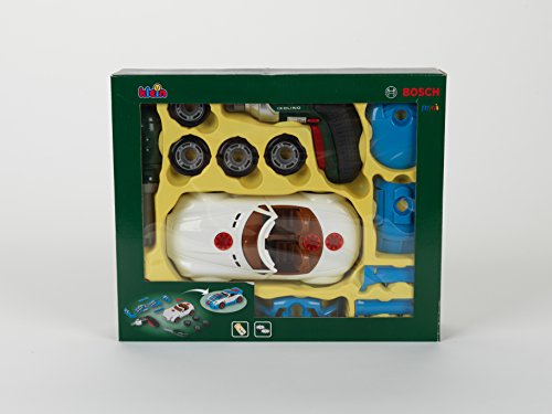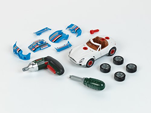 Nachwuchs-Mechanikerinnen und Mechaniker aufgepasst: Dieses Car Tuning Set im Bosch Design ist das perfekte Konstruktions-Spielzeug für alle mit Benzin im Blut: Es enthält ein zerlegbares Auto mit sechs Tuning-Zubehörteilen, vier auswechselbaren Reifen, drei austauschbaren Etikettensätzen und dazu den Bosch Akkuschrauber Ixolino, mit dem jede Schraube blitzschnell sitzt. Der kleine Akkuschrauber sieht (fast) genauso aus, wie sein große Bruder. Er klingt ähnlich und hat auch einen Rechts- und Linkslauf. Wenn aber echte Handarbeit gefragt ist, ist der Schraubendreher für jeden Einsatz bereit. Natürlich hat Theo Klein beim Tunen dieses Sets auch bei jedem Detail auf Sicherheit gesetzt: Es gibt ausschließlich abgerundete, kindgerechte Kanten und Funktionen. Selbst das Drehen des Akkuschraubers findet langsam und kindersicher statt.