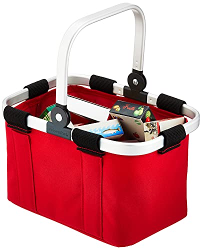 reisenthel Einkaufskorb „carrybag mini“ rot, gefüllt – Maße des Einkaufskorbes (L x B x H): 25 x 17,5 x 16,5 cm – Design original by reisenthel – strapazierfähiges Polyestergewebe – leichtes Eigengewicht angesichts den Aluminiumrahmen – gute Haltbarkeit angesichts Seitenverstärkungen – umklappbarer Bügel 21 Zubehörschachteln des Einkaufskorbes: Brot (Roggenbrot), Brötchen (Frühstücksbrötchen), Müsli (Müsli Fitness Power), Kaffee, Käse (Emmentaler Käse), Gebäck (Kaffeegebäck), Eis, Herzkuchen, Weingummi, Fischfilet (Kabeljaufilet), Hähnchen (Hähnchenschlegel), Gulasch (Gulasch via Gnocci), Würstchen (Würstchen via Pommes), Piccolino, Trattoria (Pizza Gesäß und Pilze), Mehl (Weizenmehl), Zucker (Würfelzucker), Tropentrank, Gartengemüse, Hundefutter und Porlan (Waschmittel Porlan) – Angemessen statt Kinder ab 3 Jahren