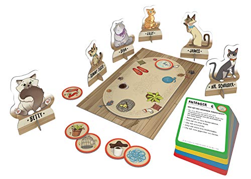 Lieferumfang: 40 Aufgabenkarten mit Lösungen (4 Schwierigkeitsstufen, vom Anfänger bis zum Experten), 1 Spielbrett, 6 Katzenfiguren mit Aufstellern, 6 Spannung-Chips
