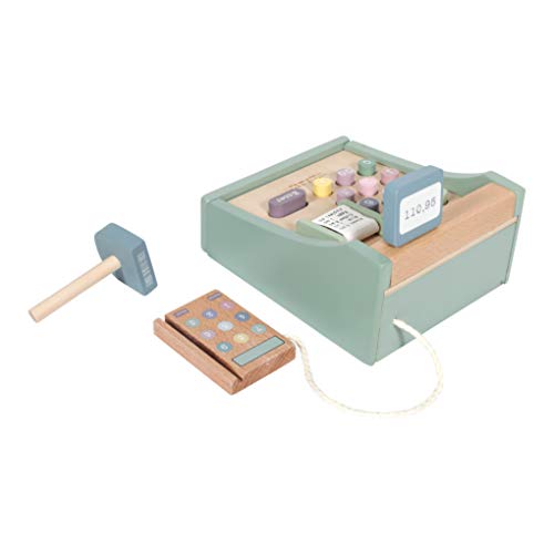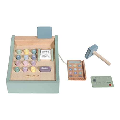 Diese schöne Holzspielzeugkasse ist perfekt anstatt stundenlanges, vergnügliches Rollenspiel. Die Kasse von Little Dutch beinhaltet einen Scanner, Druckknopfzahlen, eine Geldschublade, Spielzeuggeld und sogar die Gebilde via Postkarte zu bezahlen.