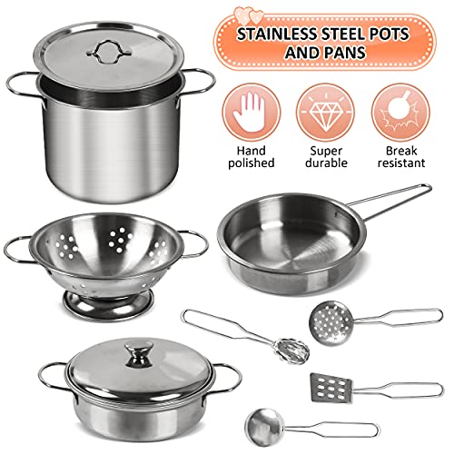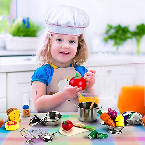 🍑【Küchenspielzeug für Kinder】 – Tigerhu 25-teiliges Kinderküchenset Enthält: Sieb, Edelstahltöpfe und -pfannen mit Deckel und Griffen, 4 Edelstahl- und elf Holzgeschirr, Schürze und eine Kochmütze.
