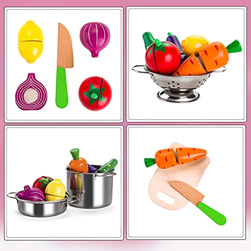 Tigerhu Küchenspielzeug Zubehör, Kinderküche Zubehör Holz, Spielküche Zubehör Lebensmittel Spielzeug Edelstahl Pfannenset Schürze Puppenküche Backformen, Rollenspiele Mädchen und Jungen