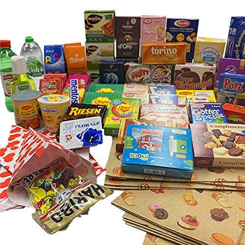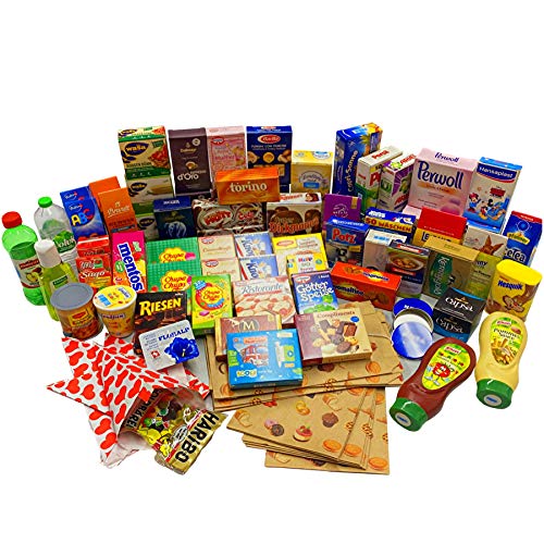 Im Set enthalten sind aus allerlei verschiedene Sachen, wie Miniatur-Faltschachteln, Miniatur-Lebensmittel-Dosen bzw. -Flaschen. So lässt sich der Kaufladen umfangreich bestücken.