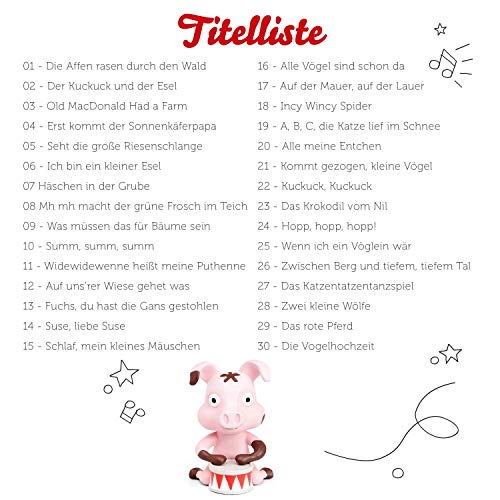 Tonies sind Hörfiguren für die Toniebox. Sie machen Hören anfassbar, denn mit ihnen bedient man die Toniebox. Man kann sie gleichwohl auch sammeln und mit ihnen spielen. Um der Geschichte zu nachspionieren, stellt man die Hörfigur einfach auf die Toniebox. Der Tonie ist der magische Schlüssel zu deinem Hörerlebnis. Stellst du ihn auf, erkennt ihn die Toniebox sofort und lädt den entsprechenden Inhalt aus der Toniecloud hinab und spielt ihn direkt ab. Einmal abstandslos geladen, bleibt der Inhalt auf der Toniebox und du kannst ihn überall, auch ohne WLAN, hören. 01 – Die Affen rasen durch den Wald 02 – Der Kuckuck und der Esel 03 – Old MacDonald Had a Farm 04 – Erst kommt der Sonnenka¨ferpapa* 2:11 05 – Seht die große Riesenschlange 06 – Ich bin ein kleiner Esel 07 – Ha¨schen in der Grube 08 – Mh mh macht der gru¨ne Frosch im Teich 09 – Was mu¨ssen das fu¨r Ba¨ume sein 10 – Summ, summ, summ 11 – Widewidewenne heißt meine Puthenne 12 – Auf uns‘rer Wiese gehet was 13 – Fuchs, du hast die Gans gestohlen 14 – Suse, liebe Suse 15 – Schlaf, mein kleines Ma¨uschen 16 – Alle Vo¨gel sind schon da 17 – Auf der Mauer, auf der Lauer 18 – Incy Wincy Spider 19 – A, B, C, die Katze lief im Schnee 20 – Alle meine Entchen 21 – Kommt gezogen, kleine Vögel 22 – Kuckuck, Kuckuck 23 – Das Krokodil vom Nil 24 – Hopp, hopp, hopp! 25 – Wenn ich ein Vöglein wär 26 – Zwischen Berg und tiefem, tiefem Tal 27 – Das Katzentatzentanzspiel 28 – Zwei kleine Wölfe 29 – Das rote Pferd 30 – Die Vogelhochzeit