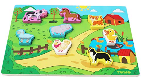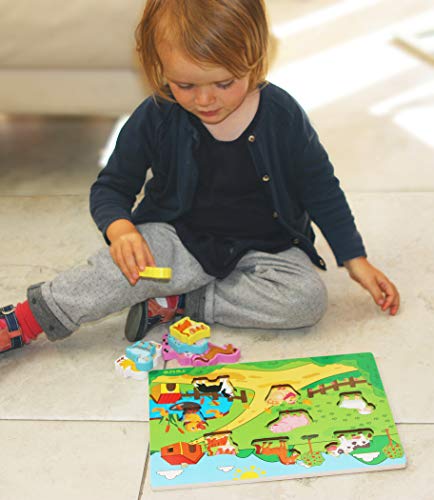 Das farbenfrohe Holzpuzzle für Kleinkinder mit Bauernhof-Tieren ist großzügig bemessen, damit kleine Hände die Tiere auf dem Brett greifen, analysieren und in die vorgesehenen Einkerbungen gleichsetzen können. In der wunderschönen Shinnington Farm leben all die niedlichen Bauernhoftiere glücklich miteinander. Das Holzbrett, die Holztiere und der Delle sind alle hochwertig verarbeitet. Das Holzpuzzle unterstützt Kindern, frühzeitig feinmotorische Fähigkeiten zu erlernen, fördert die Konzentrations-und Kommunikationsfähigkeiten. Dieses Holz-Tierpuzzle ist eine großartiges Lehrmittel in der frühkindlichen Bildung.