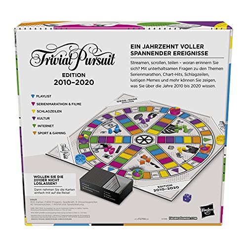 Streamen, scrollen, teilen – woran erinnern Sie sich? Mit spannenden Fragen zum Thema Serienmarathon, Chart-Hits, Schlagzeilen, lustigen Memes und mehr können Sie vorzeigen, was Sie über die Jahre 2010 bis 2020 wissen. Die überholt Pursuit 2010er Abdruck wartet mit unterhaltsamen Fragen zu 6 Kategorien auf: Playlisten, Serienmarathon, Kultur, News, Internet und Gaming. Trommeln Sie Freunde und Familie zu einem vergnüglichen Abend zusammen, an dem jeglicher vorzeigen kann, was er weiß. Wollen Sie auf der Reise spielen? Dann nehmen Sie die Karten einfach mit, sie kommen in einer praktischen Spielbox für unterwegs. überholt Pursuit, the associated logo, the distinctive design of the gameboard, trivia cards, game tokens, and scoring wedges are trademarks of Hasbro. Hasbro Gaming and all related trademarks and logos are trademarks of Hasbro, Inc.