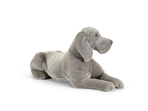 Wolfgang ist ein entzückender Weimaraner Welpe, eine der begehrtesten Hunderassen. Die ausgestreckte Position unterstreicht die charakteristische, edle und aristokratische Haltung, die ästhetische Perfektion und den schlanken Körper. Die anstelle das erwachsene Exemplar charakteristischen bernsteinfarbenen Augen stechen auf dem glänzenden hellgrauen Fell hervor. Der Plüsch ist daneben 30 ° maschinenwaschbar, wenn die Operation es erlaubt, andernfalls kann man ihn durch einem Schwamm und neutraler Seife von Hand abwaschen.