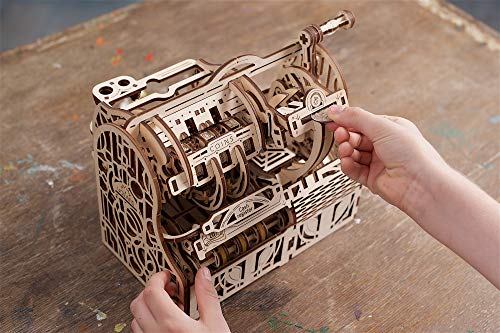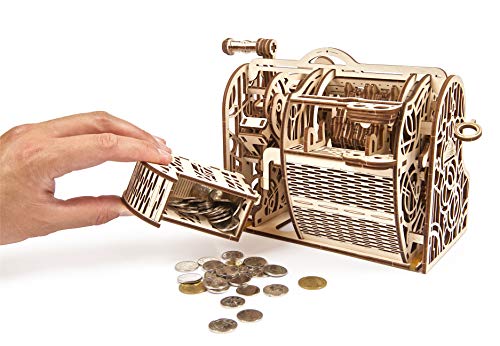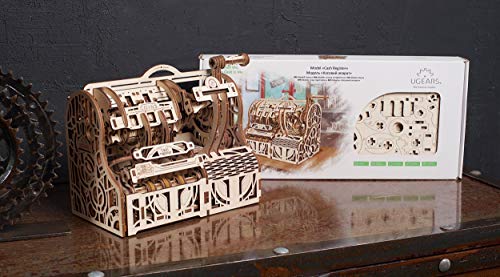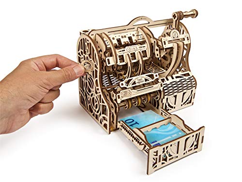 REALER PROTOTYP: Als andere UGEARS Holzmodelle und Bausätze für Erwachsene ist dieser Holzkasten eine funktionierende Miniatur einer Registrierkasse. Es enthält getrennte Kästen für Banknoten und Münzen, ein codebetätigtes Schloss, einen Zähler, einen automatischen Münzprüfer und einen Scheinakzeptor. Um den Mechanismus auszulösen, wickeln Sie einfach den Gummibandmotor auf.