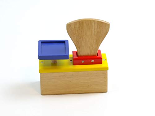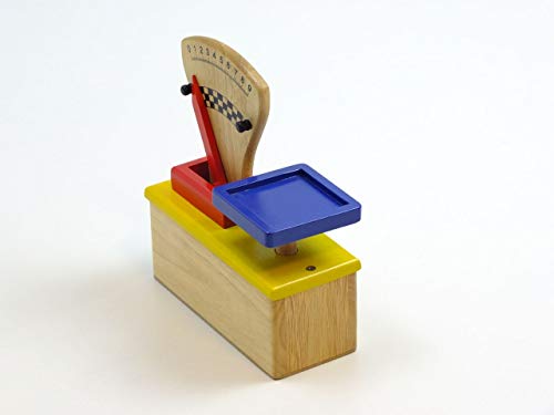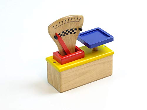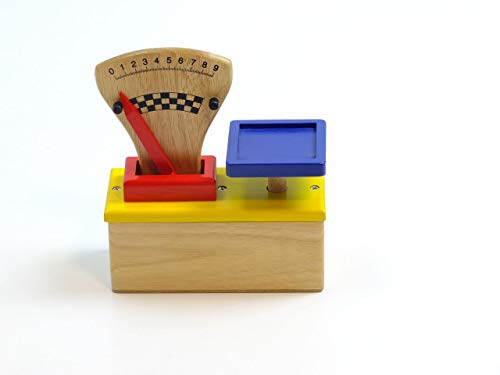 für Kinder ab 3 Jahren geeignetMaterial: Hartholz, teilweise lackiertGewicht: 520gMaße: ca. 17,5 x 7,5 x 20,5 cmFarbe: holzfarbend, betrunken, rot, gelb und schwarzholzfarbender Holz-Block (Maße: ca. 17,5 x 7 x 7,5 cm) mit in gelb abgesetzter Oberfläche, auf der die Wiege-Ablegen und durch eine rote abgesetzte Holzumrandung die Skala mit Gewichts-Tarnname fest verschraubt sindvon runter nach oben bewegliche, blaue Wiege-Ablegen (ca. 8 x 8 x 1 cm)stabiler, beweglicher Gewichts-Tarnname in der Farbe: rot, der an den Seiten der Gewichts-Skala innovativ und rechts durch kleine schwarze Holzköpfe gestoppt wirdholzfarbende Skala; von minimal 0 bis maximal 9 / Farbe der Ziffern und des Skala-Schattierung: schwarz