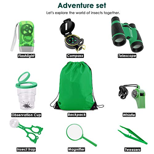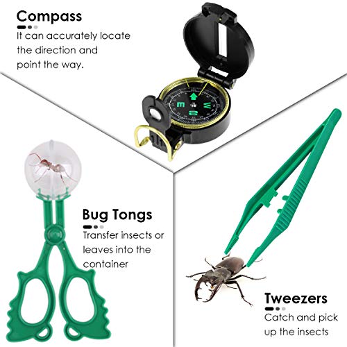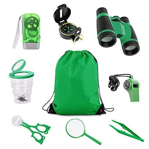 1.【8 in 1 Outdoor Explorer Kit】 – Dieses Outdoor Explorer Kit enthält 5X Fernglas, Kompass, Lupe, Taschenlampe, Pfeife, Pinzette, Insektenclip, Rucksack mit Kordelzug; Das 8-teilige Explorer-Kit ist perfekt, um Erkundungen im Freien zu begleiten, während Sie Parks, einen Zoo, Hinterhöfe, Camping oder Wandern besuchen.