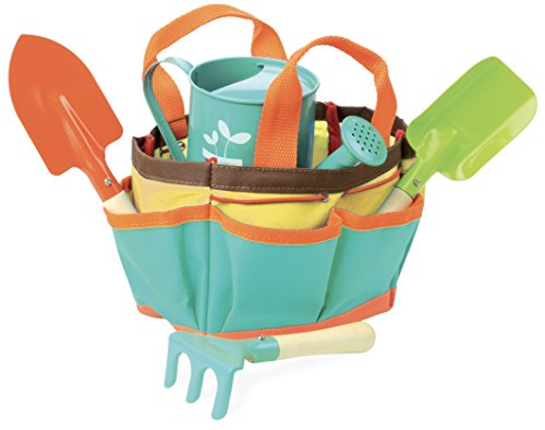 Gärtner ’s Tasche enthält eine Gießkanne, eine Schaufel, ein Rechen und einen Spaten