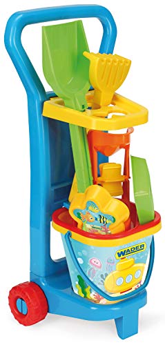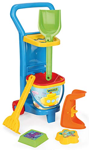 Inhalt: Caddy (zum Verstauen und Transportieren des Zubehörs), Eimer, Sieb, Schaufel, Rechen, Sandmühle und 2 Sandformen (Blume und Viereck)