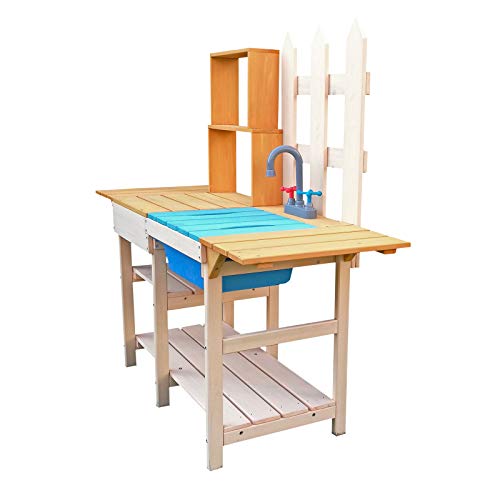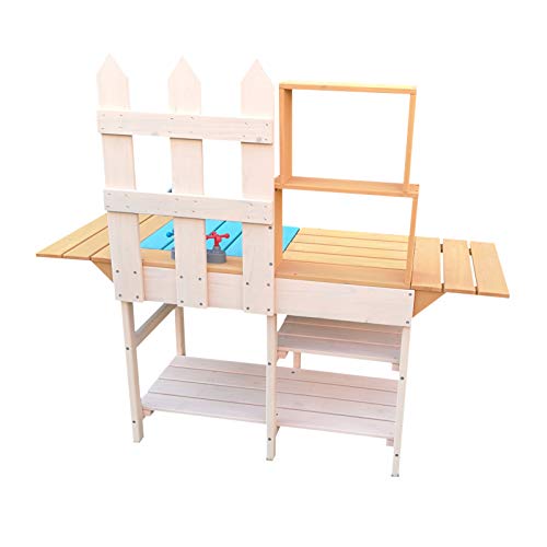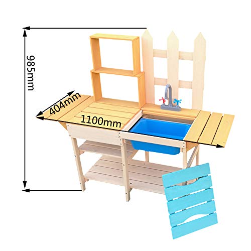 Die Kinderküche verfügt über ein großes Schüttstein, in dem mit den unterschiedlichsten Materialien experimentiert werden kann. Über der Geschirrspülbecken befinden sich ein Wasserhahn samt Knäufen für warmes und kaltes Wasser. Diese dienen der Optik und lassen die Küche für die Kleinen realistisch schaffen. Für Utensilien wie Eimer, Töpfe oder Förmchen gibt es genügend Stauraum unter der Geschirrspülbecken. Denn dort befindet sich eine Ablagefläche. Rechts neben dem Schüttstein ist eine kleine Arbeitsfläche nach Maß. Dort können gespülte Gegenstände zum Reiben abgelegt und Gartenfundstücke aufbewahrt werden oder das Ablagebrett wird bündig für das genutzt, was die Fantasie Ihres Kindes daraus macht.