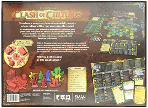 Forme jedweder einem kleinen Dorf ein mächtiges Imperium dessen Kultur deine größte Errungenschaft wird! Dazu entwickelst du neue Technologien, baust großartige Städte und verbreitest deine Kultur über die Angrenzen deiner Gegner hinaus. Du wirst Land entdecken und die See befahren und gegnerische Städte und barbarische Dörfer erobern. Mit seinen zwölf Fortschrittskategorien inklusive verschiedener Regierungsformen, einem modularen Spielbrett, superben Stadtspielsteinen und vielem mehr, erlaubt Clash of Cultures eine Diversität Möglichkeiten, um deine ultimativen Ziele zu aneignen: Sei die eine Kultur, an die man sich erinnert und die anstelle tausende von Jahren verehrt wird. Wirst du der Häuptling dieser Kultur sein?
