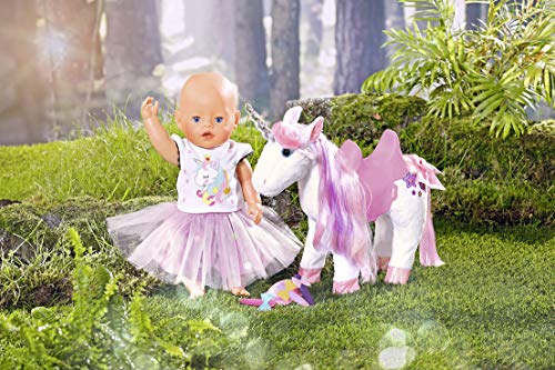 BABY born ist letzte Nacht im Traum auf dem Regenbogen spazieren gegangen. Mitten im Sternenstaub kam ihr ein weißes, ganz weiches Einhorn entgegen. Das Horn der süßen Tierfreundin leuchtet und sie begrüßt alle mit einem putzigen Einhorn-Laut. BABY born ist jedes Mal ganz fasziniert davon. Am liebsten bürstet sie die bunte Mähne und den Schweif des Einhorns und kreiert phantasievolle Frisuren, die dann mit den 3 Haarspangen befestigt werden. Nach dem Striegeln wird der rosa Sattel befestigt, so dass BABY born auf ihrer neuen Freundin reiten kann. Ein sanfter Reproduktion aufs linke Ohr setzt die glitzernden Hufe des Einhorns in Bewegung. Nun reiten beiden im Sternenstaub über den Regenbogen. • Hochwertiges Zubehör und original Kleidung für die BABY born Markenspielpuppe • Für erweitertes, abwechslungsreiches und lang anhaltendes Spielvergnügen BABY born Animal Friends Einhorn mit Bewegung und Sound-Effekt. Inklusive Sattel, Bürste und 3 Haarspangen.