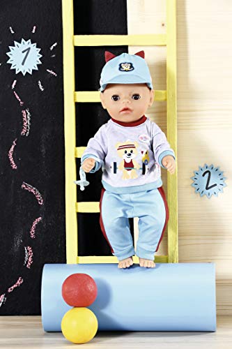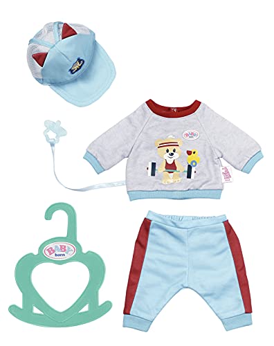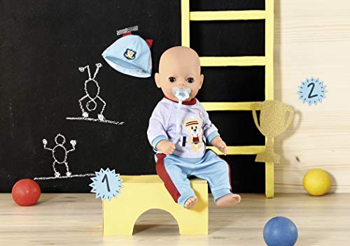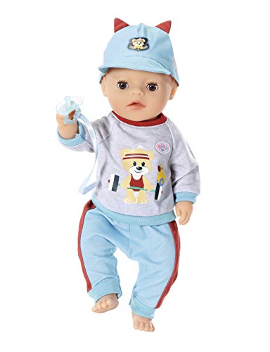 PUPPENKLEIDUNG MIT SÜSSEN MOTIVEN: Im coolen Sport Outfit mit Bär Bruno als Gewichtheber wird BABY born besonders stark. Neben Bär Bruno ist auch Ente Berta sportlich auf dem grauen Shirt aufgedruckt. Die blaue Jogginghose ist mit einem roten Seitenstreifen verziert