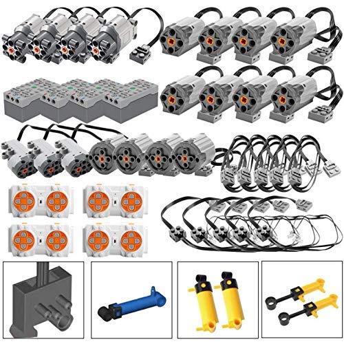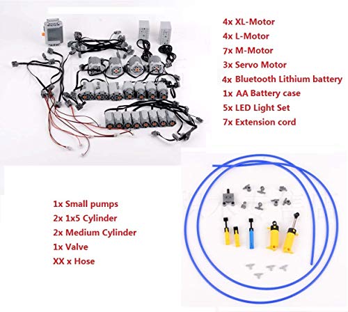 Mit Technic Power Functions Set: 19 (4XL, 4L, 8M und 3 Servo) Motoren, 4 Bluetooth Lithium Batterie, 4 Fernbedienung, 1 AA Batteriebox, 5 LED Beleuchtungsset, 7 Verlängerungskabel. Mit pneumatischem Teile-Set: 1 Luftpumpe, 4 Zylinder, 1 Schalter