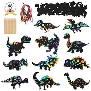 LIZHIGE Kratzbild Kratzpapier, 48 Stück Kinder DIY Kratzpapier mit 12 Stück Holzstiften und 48 Bändern, Dinosaurier…